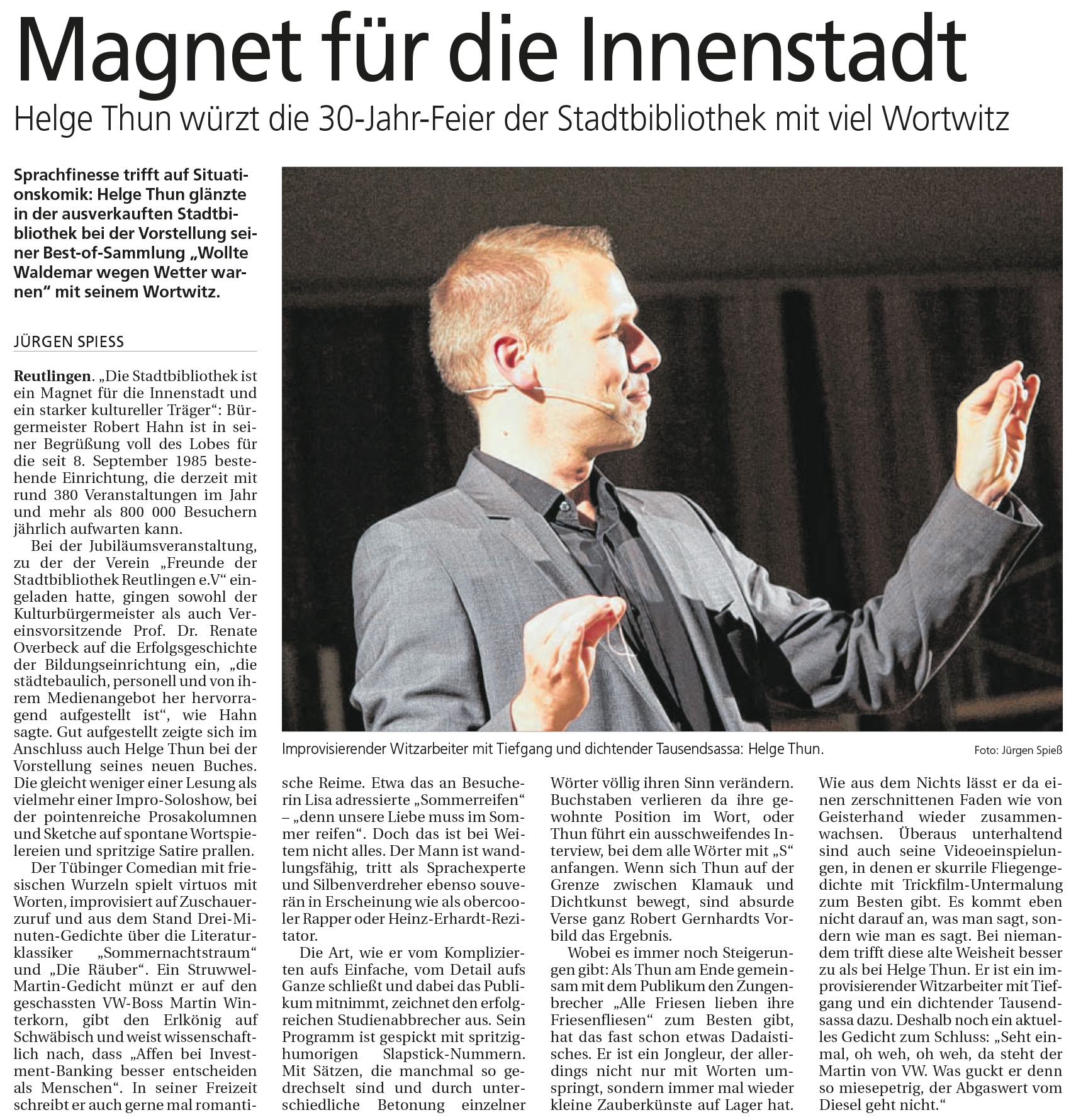Helge Thun würzt die 30-Jahr-Feier der Stadtbibliothek mit viel Wortwitz | Reutlinger Nachrichten 17.10.2015