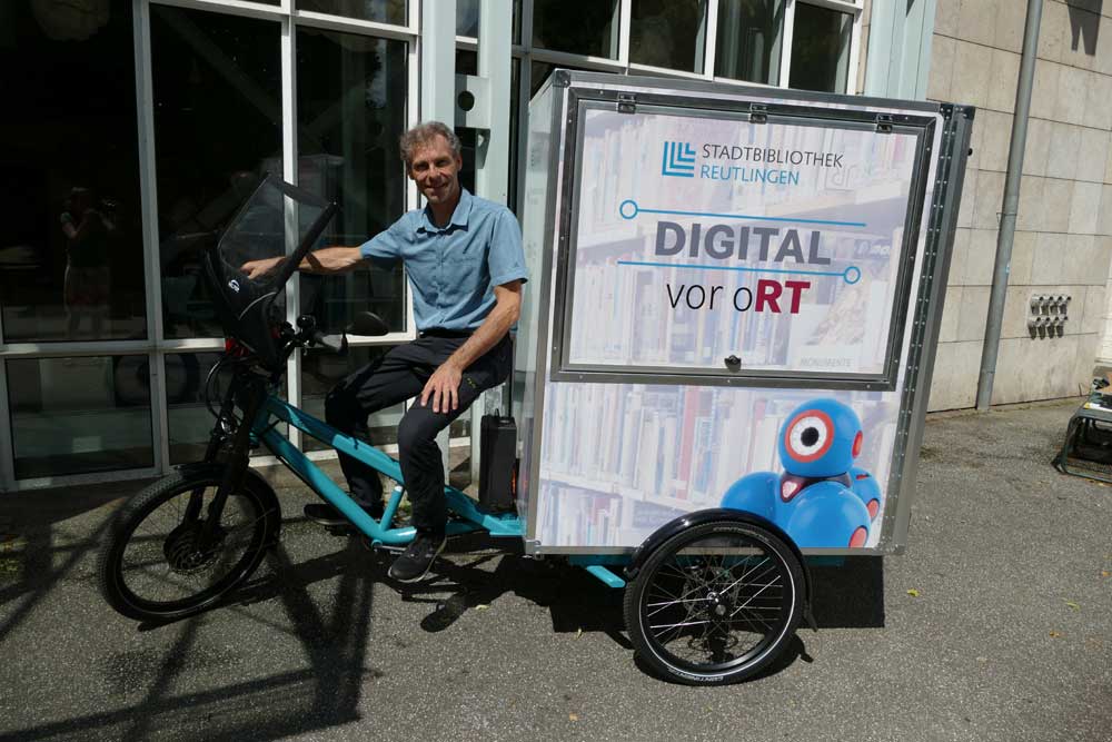 Mit unserem „Media-Bike“ bieten wir in Reutlingen und in den unterversorgten Stadtteilen, den kleinen nebenamtlichen Zweigstellen und bei weiteren Partnern und Kunden (Schulen, Kitas, Behinderteneinrichtungen etc.) mit Veranstaltungen eine digitale Grundversorgung „vor oRT“.