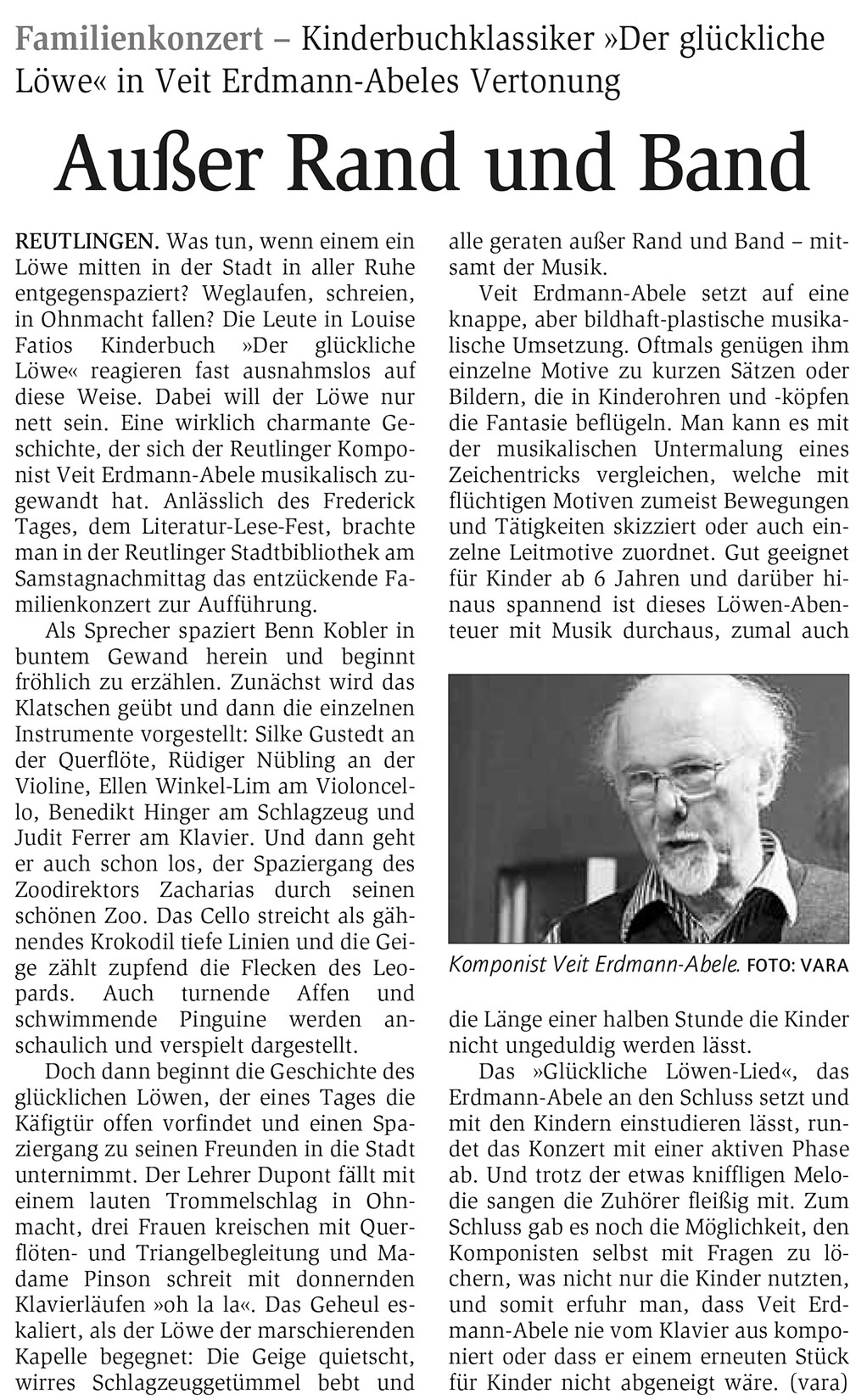 Familienkonzert - Kinderbuchklassiker "Der glückliche Löwe" in Veit Erdmann-Abeles Vertonung | Reutlinger General-Anzeiger www.gea.de 21.10.2014