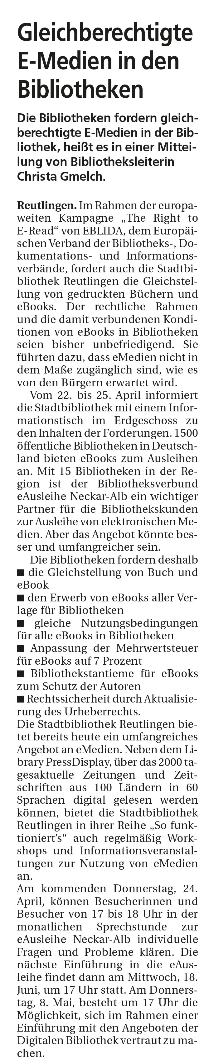 Die Bibliotheken fordern gleichberechtigte E-Medien in der Bibliothek, heißt es in einer Mitteilung von Bibliotheksleiterin Christa Gmelch | Reutlinger Nachrichten 19.4.2014