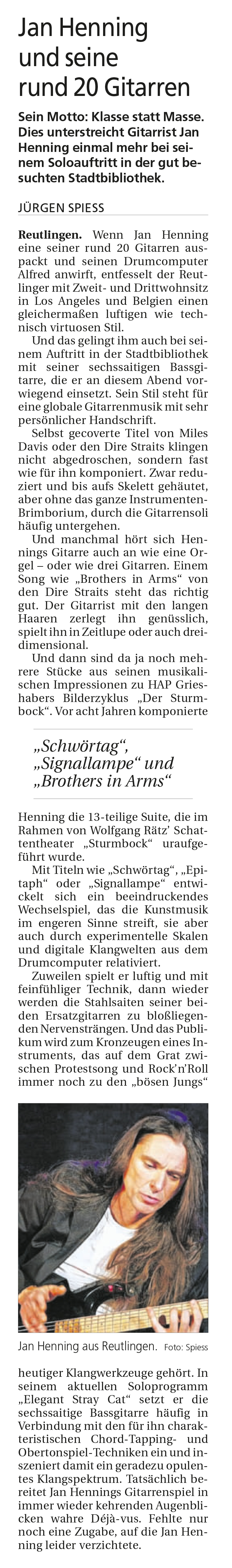 Sein Motto: Klasse statt Masse. Dies unterstreicht Gitarrist Jan Henning einmal mehr bei seinem Soloauftritt in der gut besuchten Stadtbibliothek | Reutlinger Nachrichten 27.11.2014