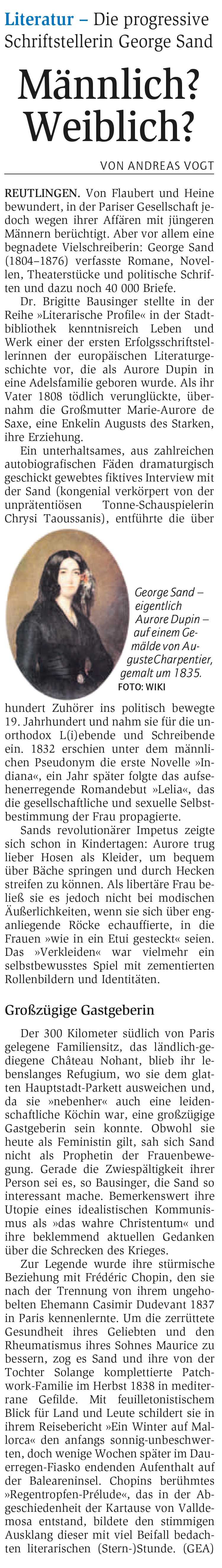 Literatur - Die progressive Schriftstellerin George Sand | Reutlinger General-Anzeiger www.gea.de 17.6.2014