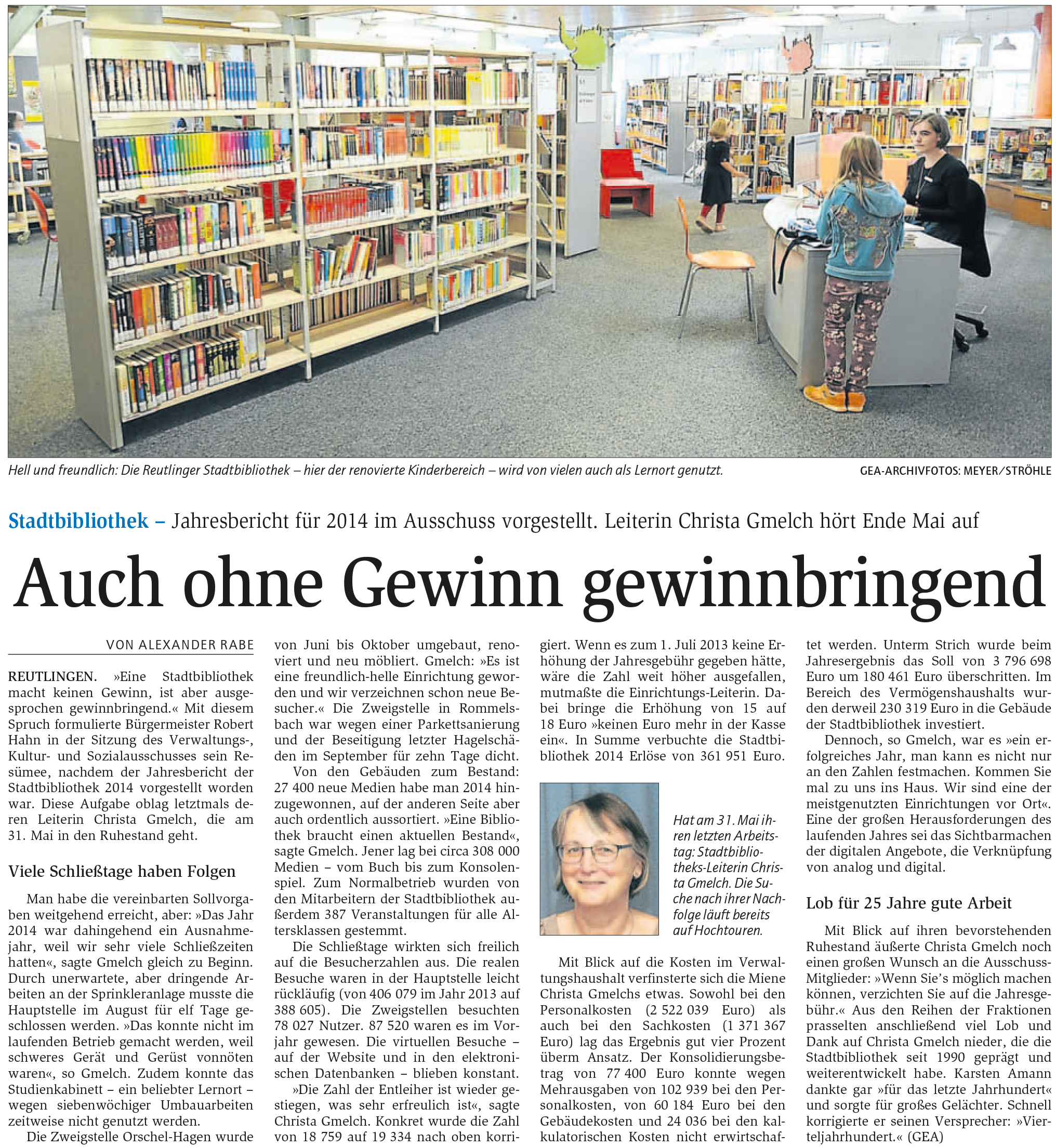 Stadtbibliothek - Jahresbericht für 2014 im Ausschuss vorgestellt. Leiterin Christa Gmelch hört Ende Mai auf | Reutlinger General-Anzeiger www.gea.de 22.10.2015