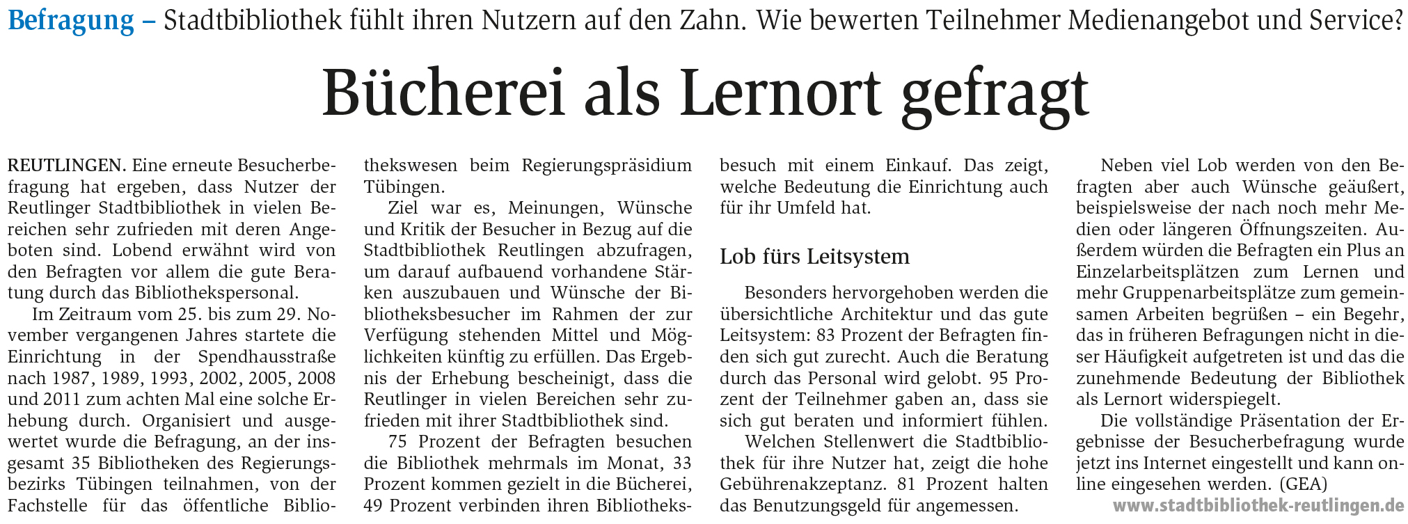 Befragung - Stadtbibliothek fühlt ihren Nutzern auf den Zahn. Wie bewerten Teilnehmer Medienangebot und Service? | Reutlinger General-Anzeiger www.gea.de 18.6.2015