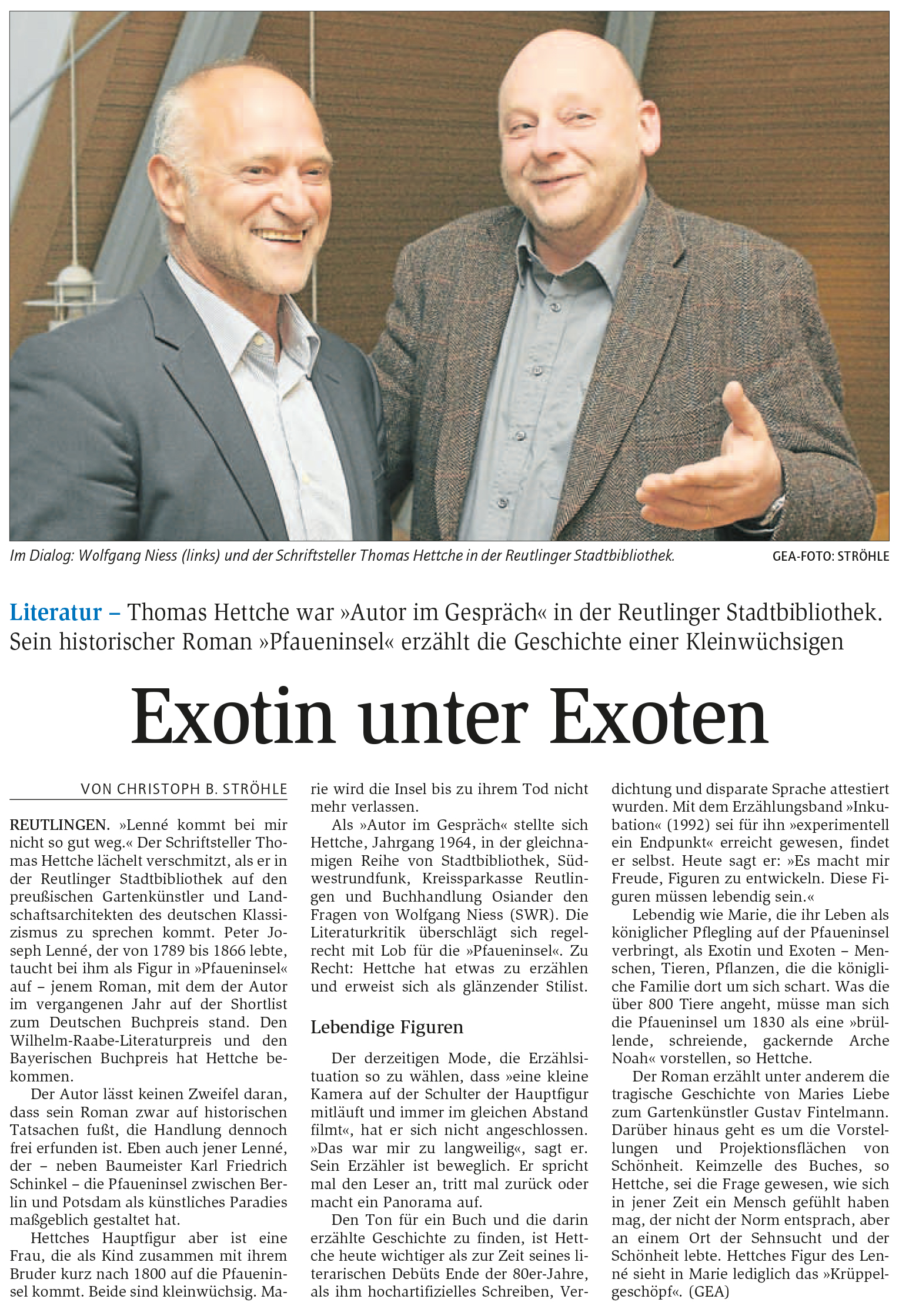 Literatur - Thomas Hettche war "Autor im Gespräch" in der Reutlinger Stadtbibliothek. Sein historischer Roman "Pfaueninsel" erzählt die Geschichte einer Kleinwüchsigen | Reutlinger General-Anzeiger www.gea.de 24.4.2015