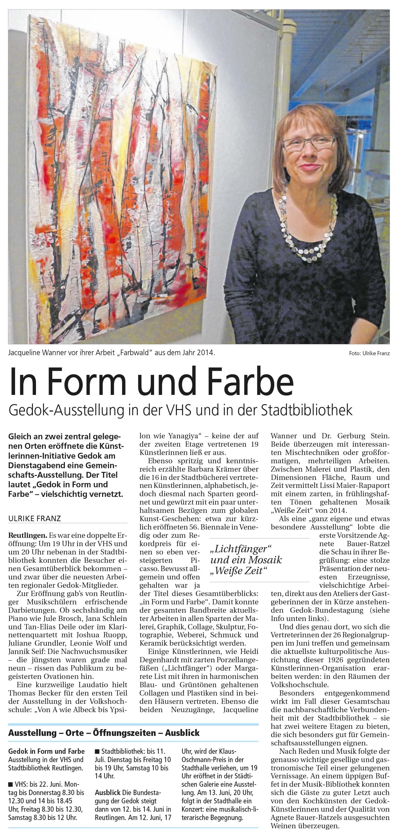 Gedok-Ausstellung in der VHS und in der Stadtbibliothek | Reutlinger Nachrichten 15.5.2015