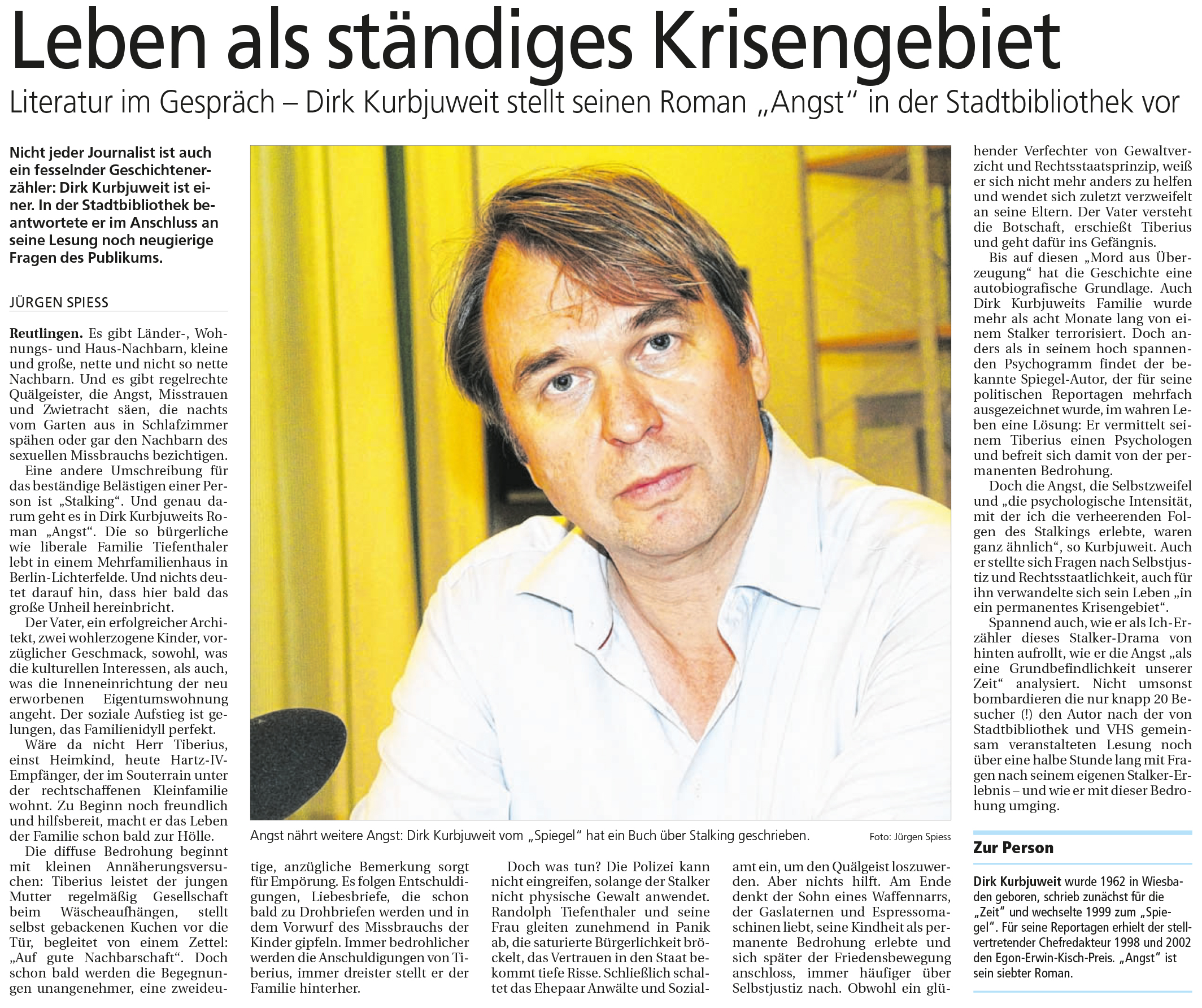 Literatur im Gespräch - Dirk Kurbjuweit stellt seinen neuen Roman "Angst" in der Stadtbibliothek vor | Reutlinger Nachrichten 3.7.2015
