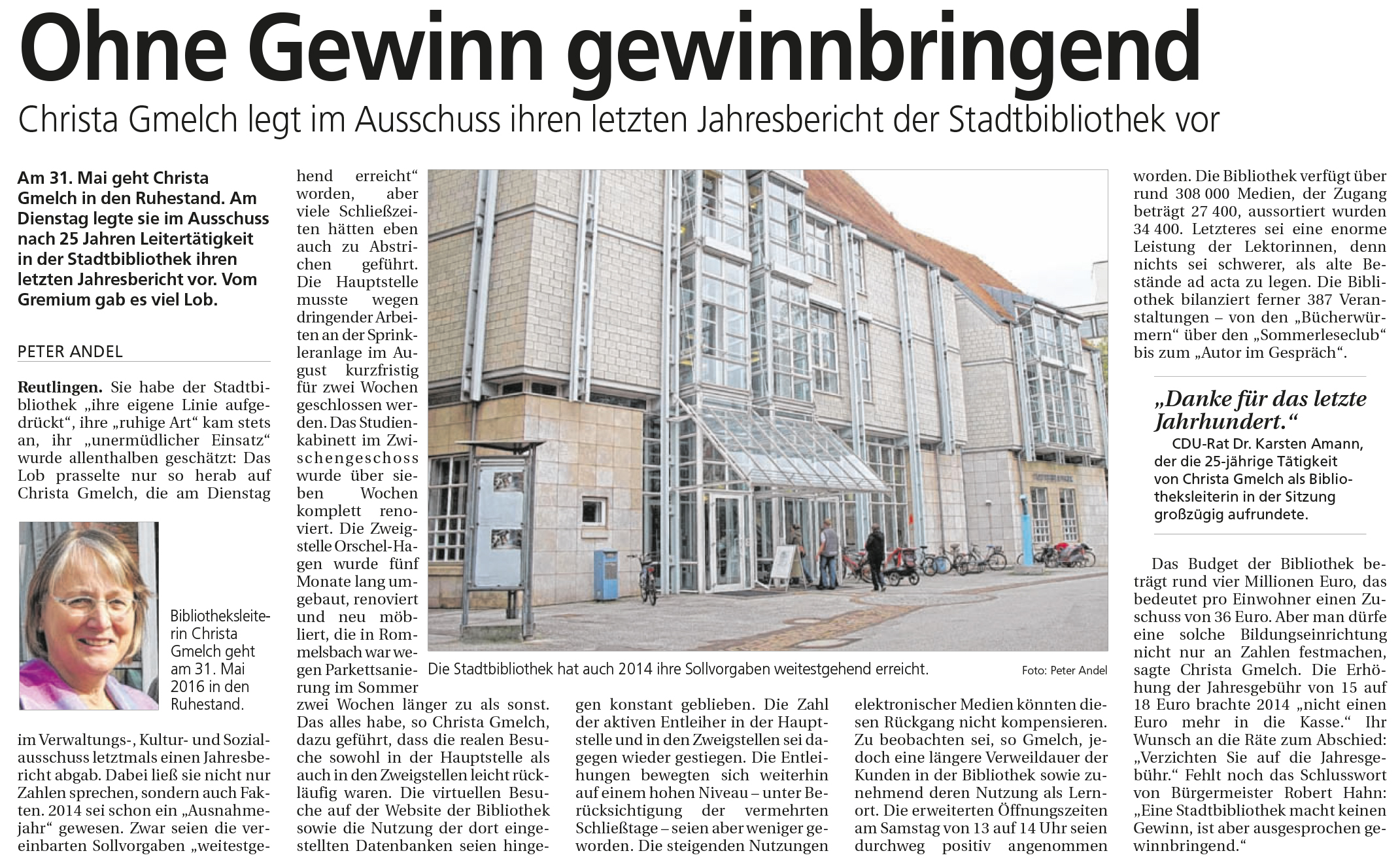 Christa Gmelch legt im Ausschuss ihren letzten Jahresbericht der Stadtbibliothek vor | Reutlinger Nachrichten 22.10.2015