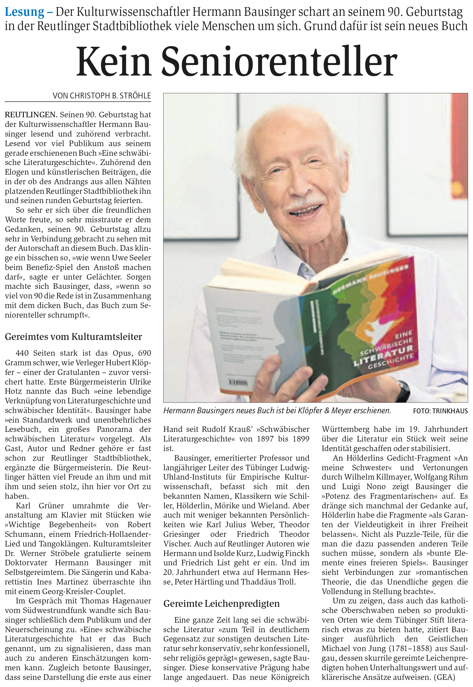 Literatur - Der Kulturwissenschaftler Hermann Bausinger schart an seinem 90. Geburtstag in der Reutlinger Stadtbibliothek viele Menschen um sich. Grund dafür ist sein neues Buch | Reutlinger Generalanzeiger www.gea.de 19.9.2016