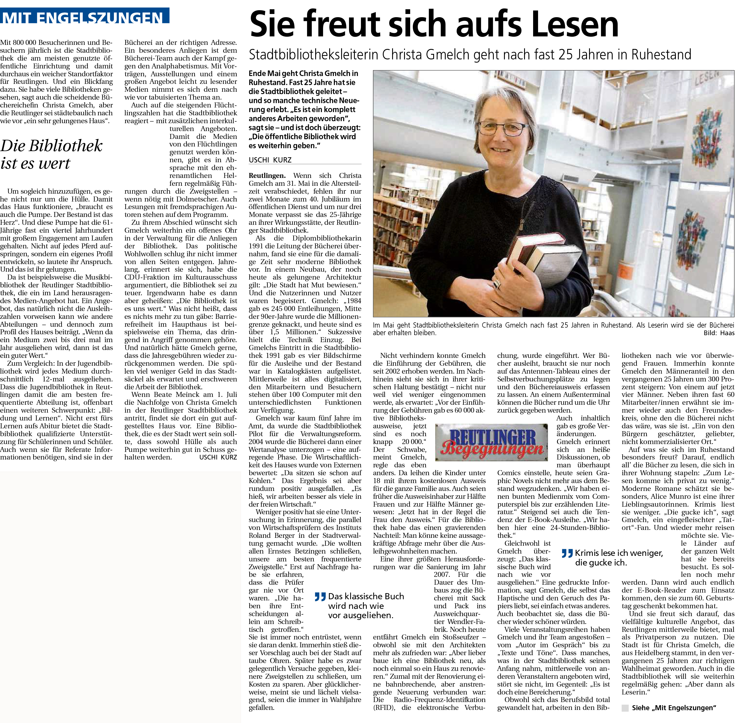 Stadtbibliotheksleiterin Christa Gmelch geht nach fast 25 Jahren in Ruhestand | Schwäbisches Tagblatt 9.2.2016