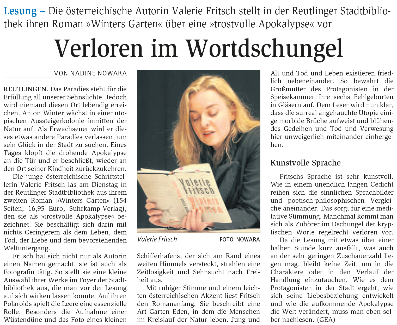 Lesung - Die österreichische Autorin Valerie Fritsch stellt in der Reutlinger Stadtbibliothek ihren Roman "Winters Garten" über eine "trostvolle Apokalypse" vor | Reutlinger General-Anzeiger www.gea.de 21.01.2016