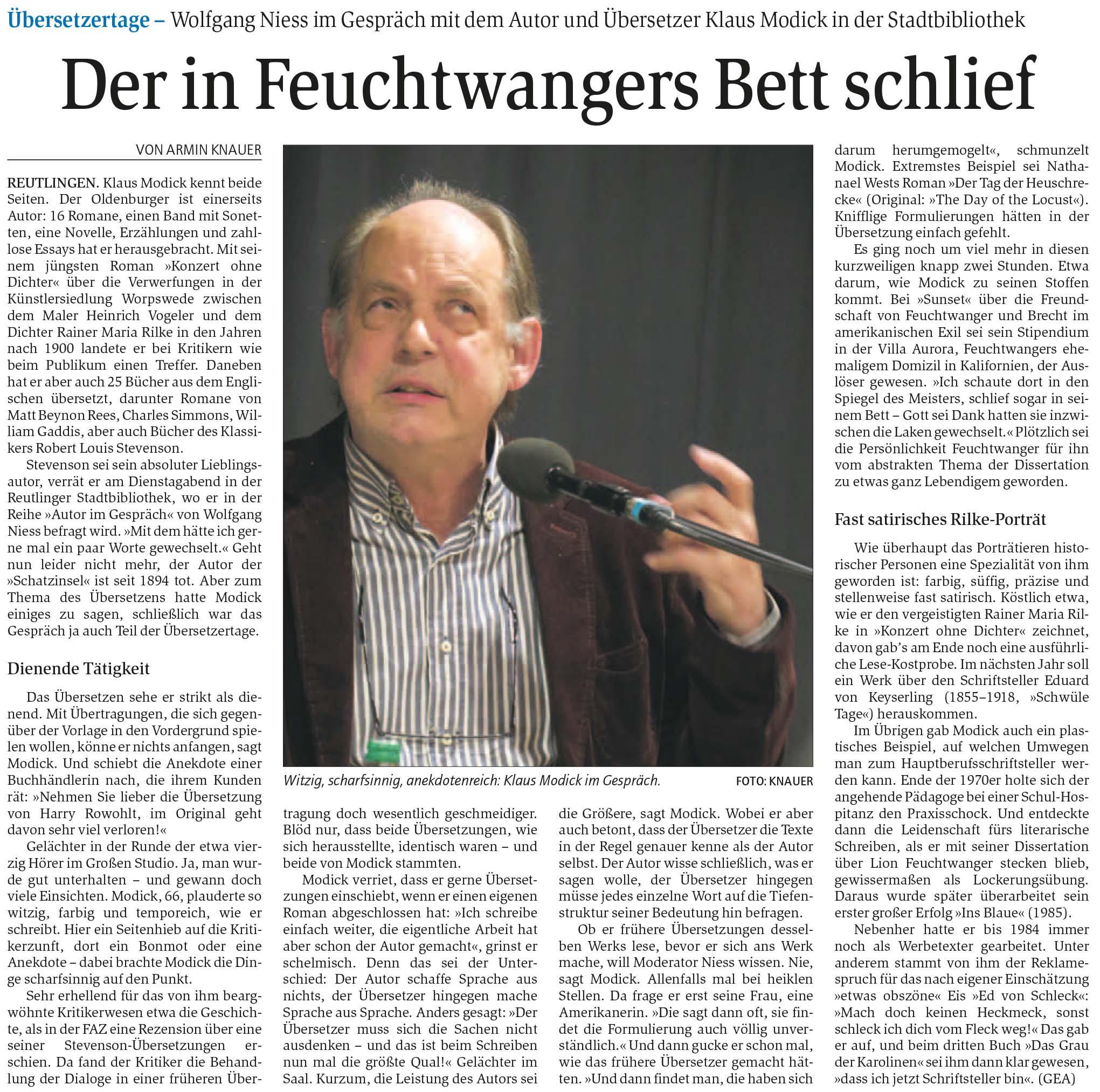 Übersetzertage - Wolfgang Niess im Gespräch mit dem Autor und Übersetzer Klaus Modick in der Stadtbibliothek | Reutlinger General-Anzeiger www.gea.de 16.11.2017