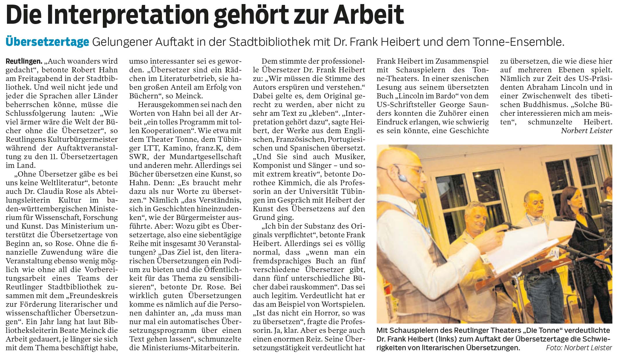 Übersetzertage - Gelungener Auftakt in der Stadtbibliothek mit Dr. Frank Heibert und dem Tonne-Ensemble. | Reutlinger Nachrichten 13.11.2017