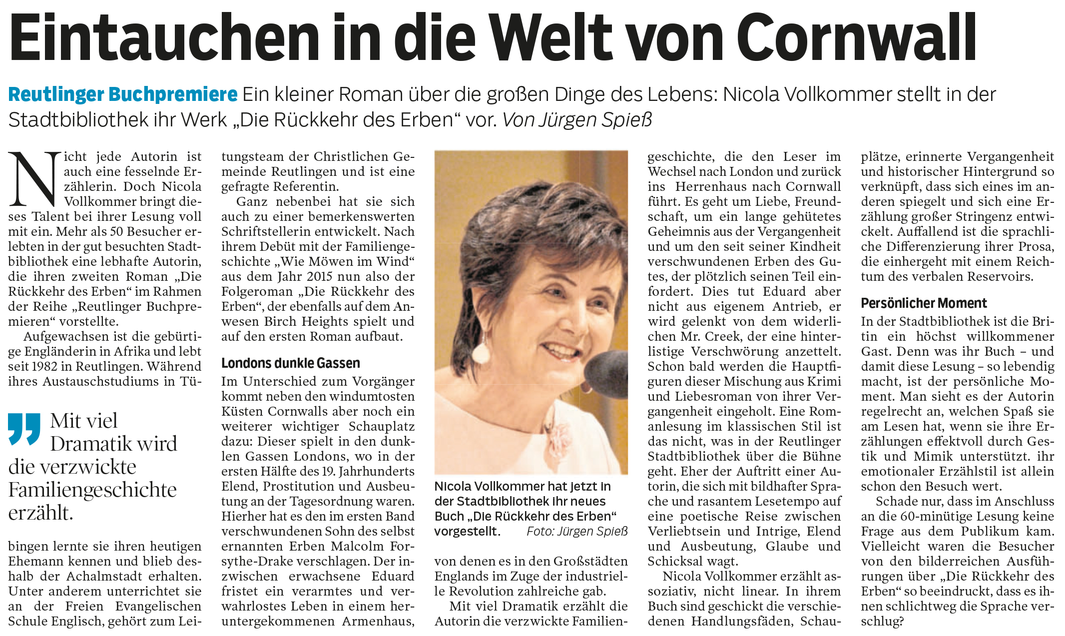 Reutlinger Buchpremiere - Ein kleiner Roman über die großen Dinge des Lebens: Nicola Vollkommer stellt in der Stadtbibliothek ihr Werk "Die Rückkehr des Erben" vor. | Reutlinger Nachrichten 15.12.2017
