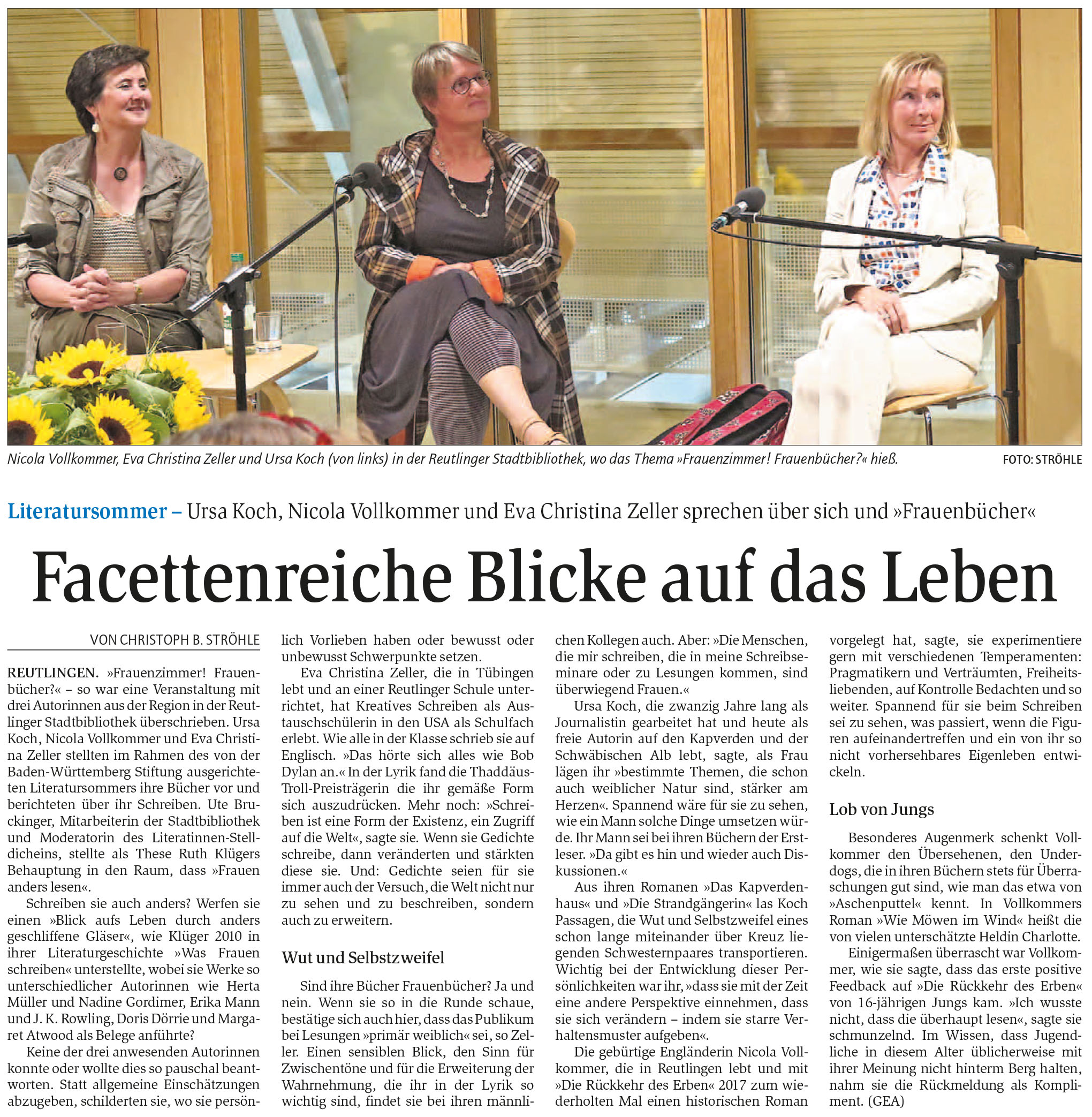 Literatursommer - Ursa Koch, Nicola Vollkommer und Eva Christina Zeller sprechen über sich und "Frauenbücher" | Reutlinger General-Anzeiger www.gea.de 15.6.2018