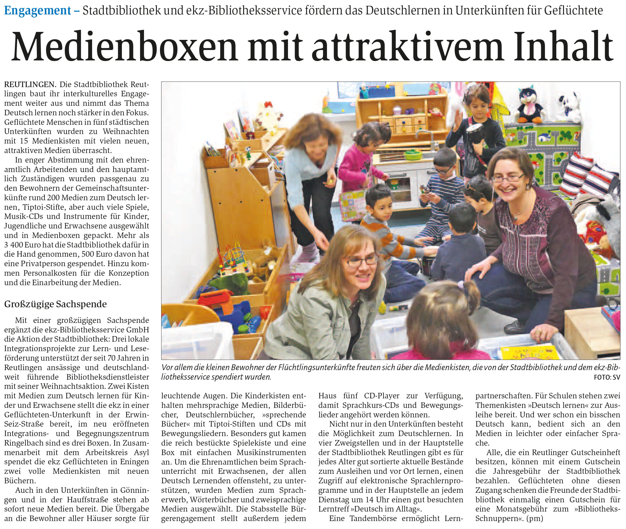 Engagement - Stadtbibliothek und ekz-Bibliotheksservice fördern das Deutschlernen in Unterkünften für Geflüchtete | Reutlinger General-Anzeiger www.gea.de 9.1.2018
