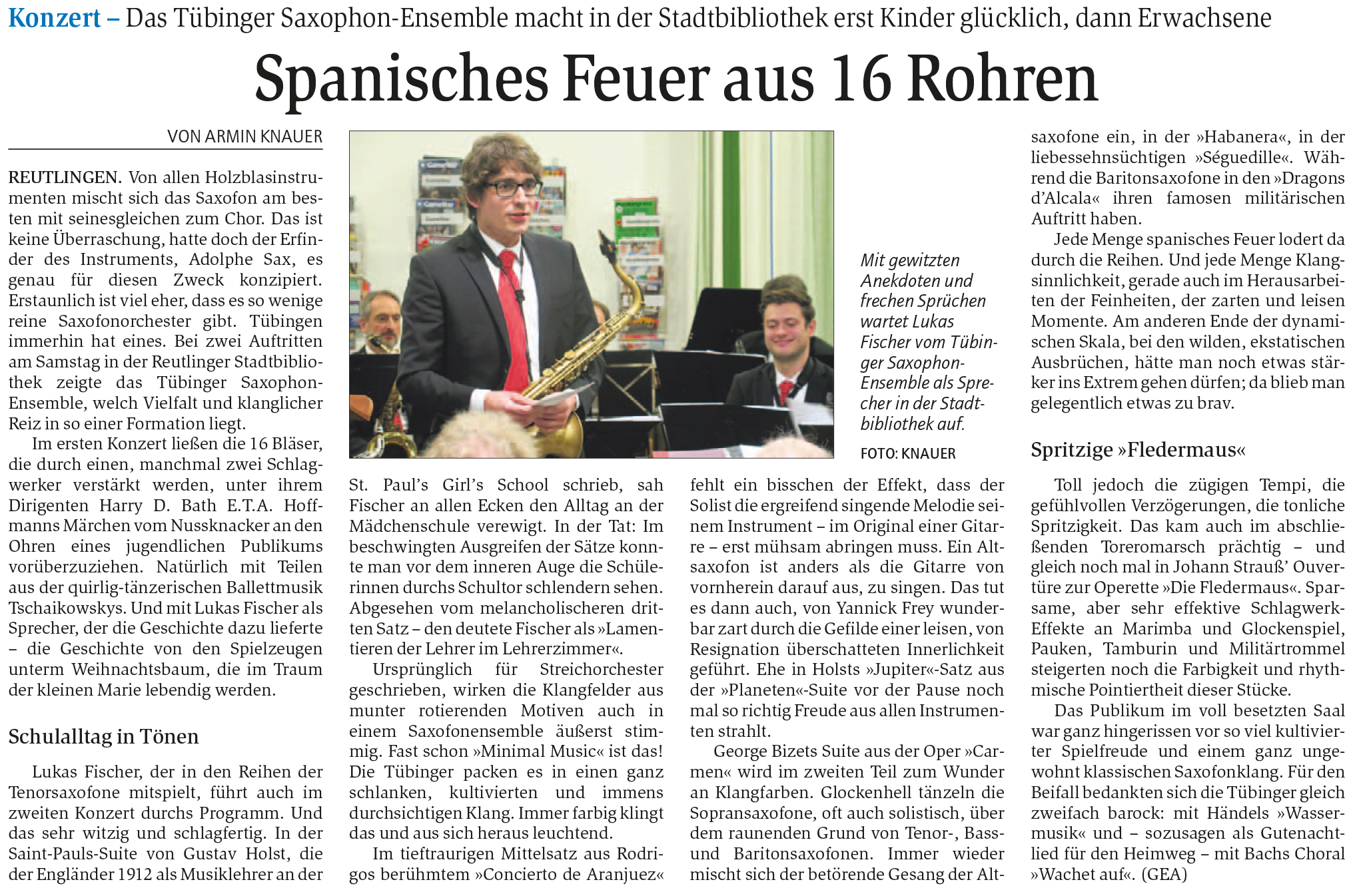 Konzert - Das Tübinger Saxophon-Ensemble macht in der Stadtbibliothek erst Kinder glücklich, dann Erwachsene | Reutlinger General-Anzeiger www.gea.de 29.1.2018