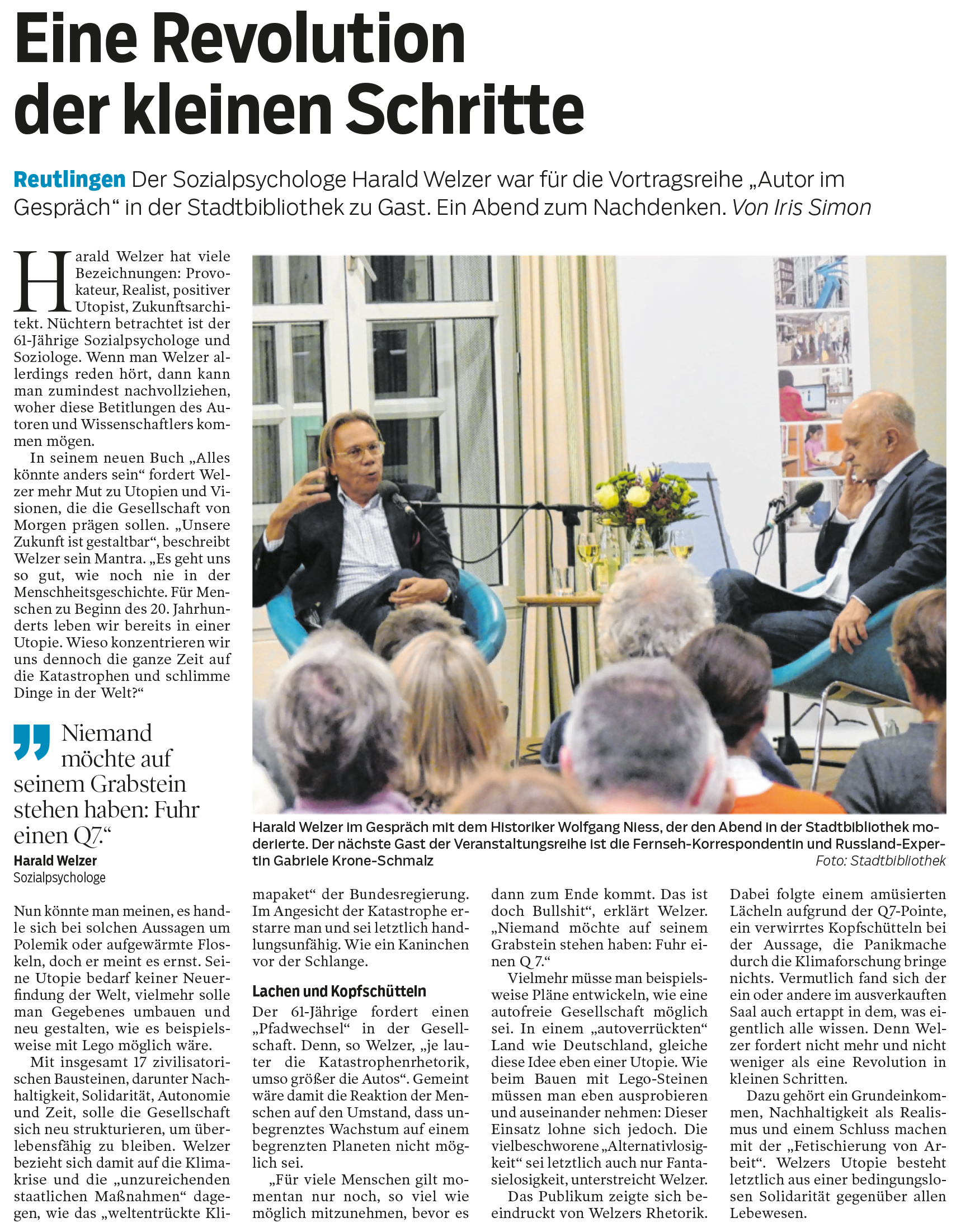 Reutlingen - Der Sozialpsychologe Harald Welzer war für die Vortragsreihe „Autor im Gespräch“ in der Stadtbibliothek zu Gast. Ein Abend zum Nachdenken. | Reutlinger Nachrichten 25.10.2019