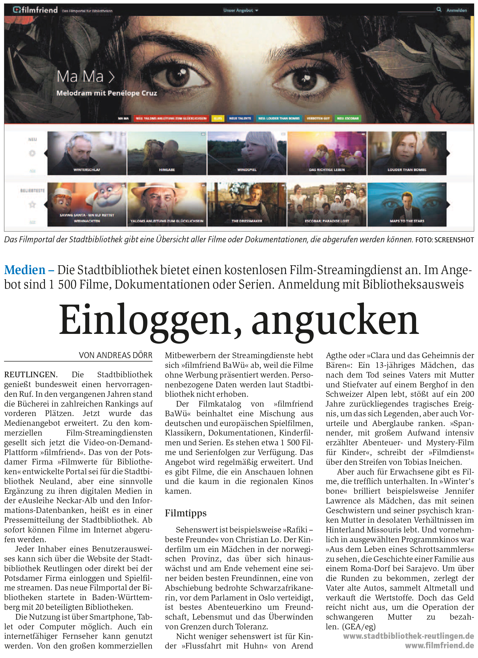 Medien - Die Stadtbibliothek bietet einen kostenlosen Film-Streamingdienst an. Im Angebot sind 1500 Filme, Dokumentationen oder Serien. Anmeldung mit Bibliotheksausweis | Reutlinger General-Anzeiger www.gea.de 7.1.2019